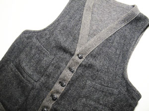 50年代頃 ウール ヘリンボーン柄 4Pベスト 程度は良いです。目立った汚れや破れなどは見あたりません。全体は黒グレーのヘリンボーン、パイピング部分はゴマ塩ウール、背面は混じり合ったツイード風になっています。ボタンも全てオリジナルの物が揃っています。ポケットの形なども良くとても雰囲気のある逸品です。 サイズ:着丈48,5cm(背面は短いです。)、身幅45,5cm